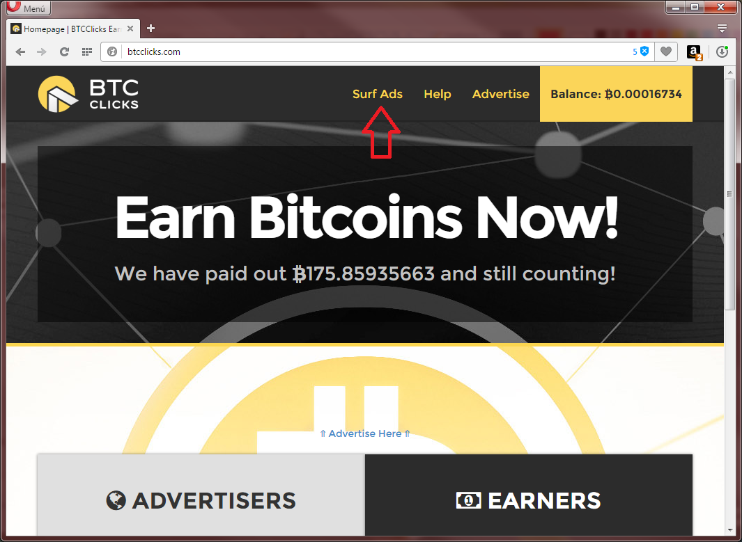 1. Al haber iniciado sesión en la web debes hacer click en el link "Surf Ads" como se ve en la siguiente imagen.